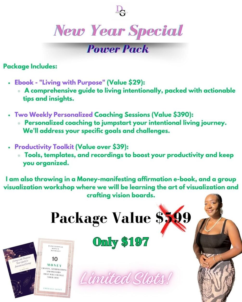 Get ready to transform your life with our exclusive offer. The "Intentional Living Transformation Package" is designed to help you enhance your productivity, organization, and goal-setting skills while living with intention. This limited-time offer includes a range of valuable resources and personalized coaching to guide you on your intentional living journey. If you are transitioning from careers or relationships, trying to find whole-life wellness, needing executive balance in your busy work and personal life, or you're ready to do a digital detox! This package is for you.